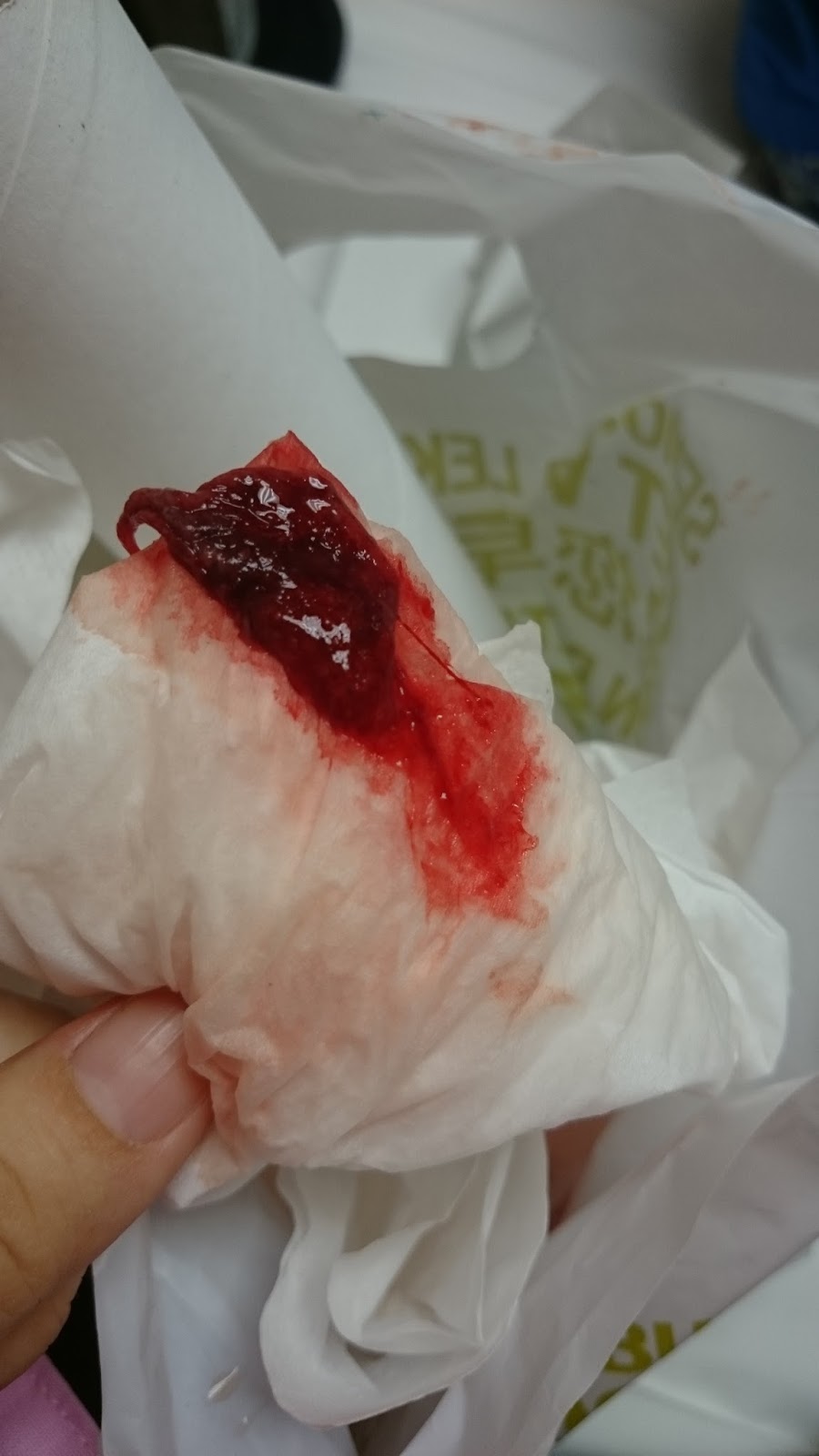 He then met me at the emergency after around 30 minutes and the blood hasn't stop. After around 3 plastics everyone finally agree that I have to go back to the OR. Clots of bloods are getting worse and fresh blood are furiously running back to my throat and I vomited the blood as they can't be swallowed. Swallowing blood can cause internal irritation.